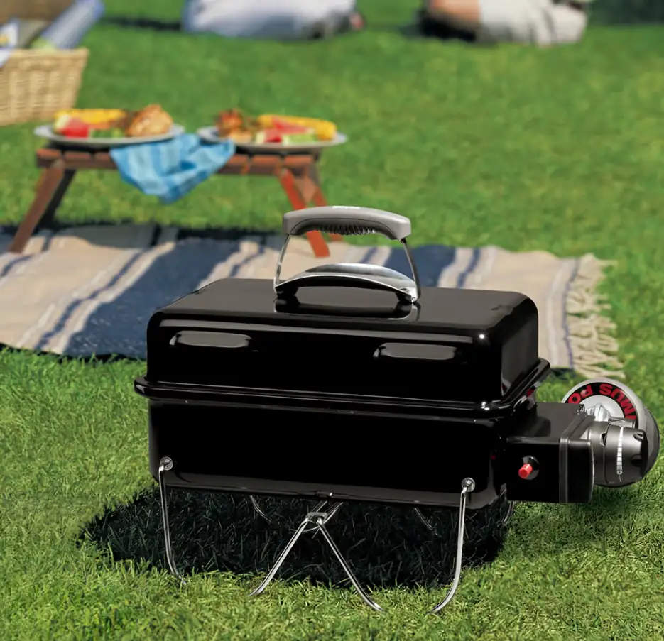 Barbecue de type Weber gaz Anywhere (sans repas). Une cartouche de gaz à visser CG1750 est comprise (valable 1 repas). La location du barbecue n’est pas nécessaire lors de la commande de repas brochettes.